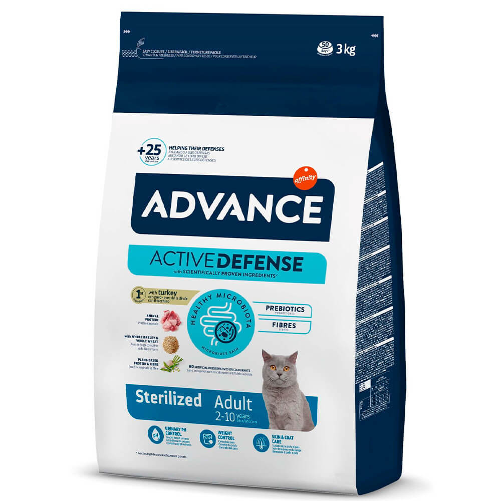 Advance Sterilized Adult é um alimento completo e equilibrado especialmente indicado para gatos adultos com idades entre os 1 e 10 anos. Ajuda a reforçar as defesas e barreiras naturais do gato, graças aos polifenóis naturais e ao alto teor proteico. Formulada com peru e cevada e imunoglobulinas, que contribuem para uma digestão saudável e boa saúde intestinal.