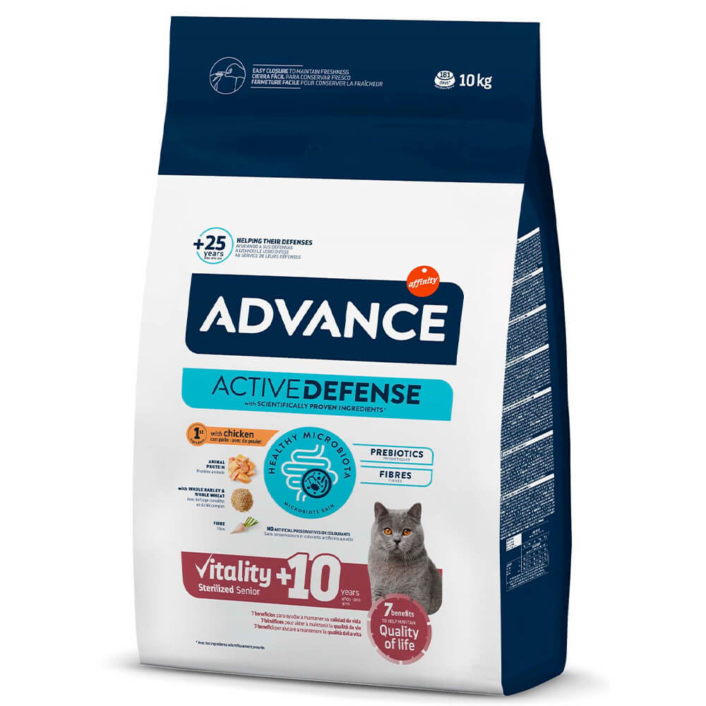 Advance Sterilized Senior +10 é um alimento completo e equilibrado especialmente indicado para gatos seniores, com mais de 10 anos. Ajuda a reforçar as defesas e barreiras naturais do gato, graças aos polifenóis naturais e ao alto teor proteico. O nível reduzido de energia metabolizável e o alto teor em fibra favorecem o controlo do peso e dão maior sensação de saciedade. A fibra e a L-carnitina reduzem o nível calórico do alimento, ajudando a metabolizar a gordura.