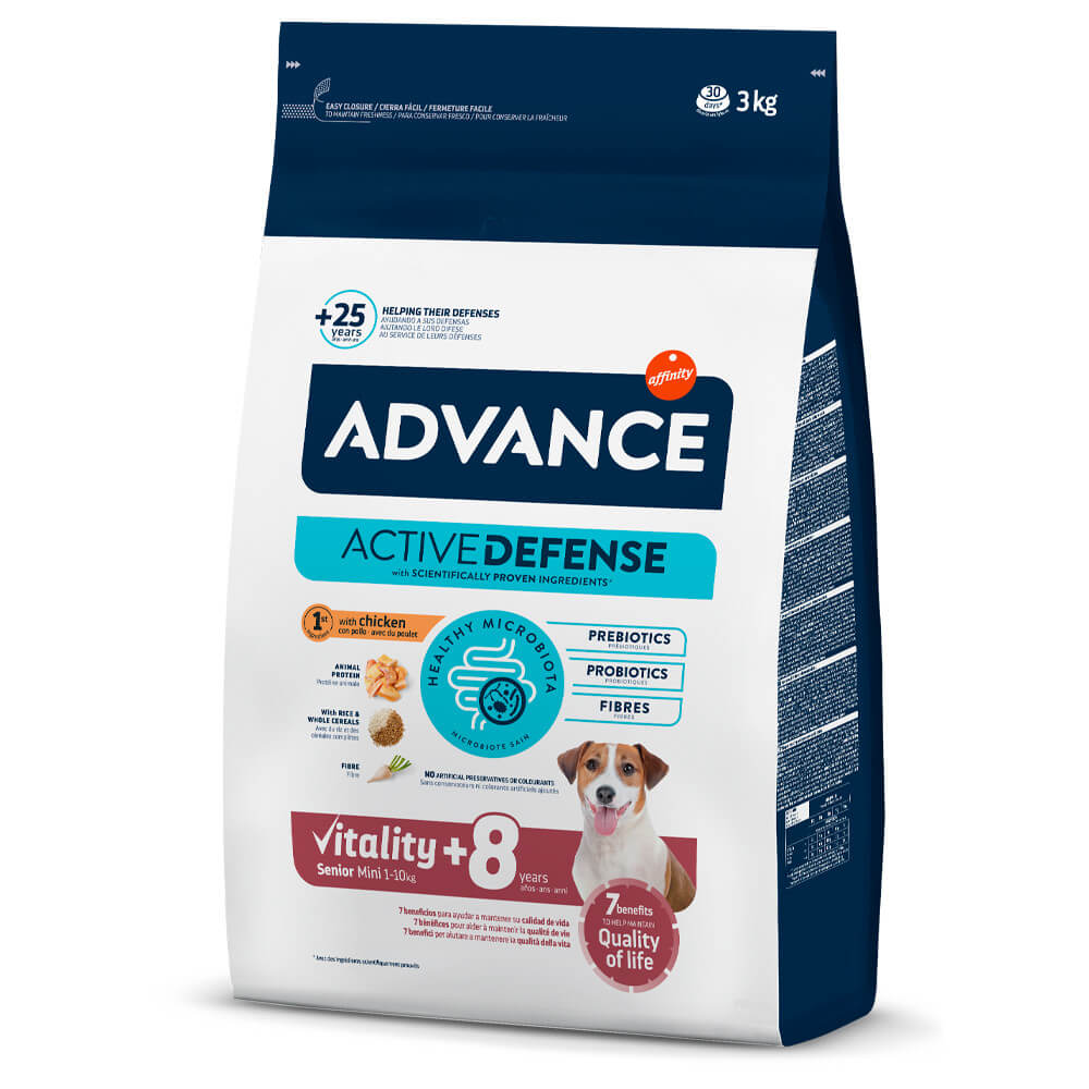 Advance Sénior 8+ Mini é um alimento seco adequado a cães seniores de porte pequeno (até 10 kg). Um alimento que ajuda a reforçar as defesas naturais do cão, graças a imunoglobulinas ativas e polifenóis naturais. As imunoglobulinas ativas são proteínas naturais que ajudam a manter a saúde intestinal e os polifenóis naturais, em conjunto com as vitaminas, ajudam a retardar o envelhecimento celular.