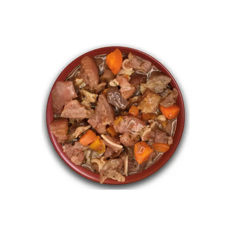 97% de orelha de porco fresca no molho, ervilhas, cenouras, batata-doce, especiarias.
