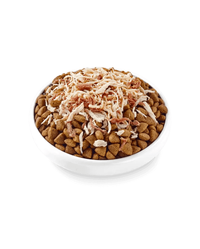 Componentes: Peito de frango (45 %), carne de vaca (5 %), gelificante vegetal, amido de batata.