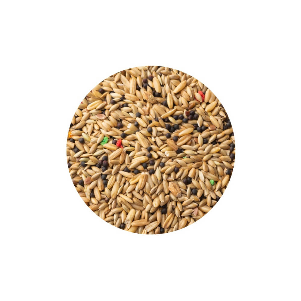 Sementes de alpista, aveia descascada, colza, linhaça, biscoitos multicores (farinha, trigo, sal, corantes E102, E124, E142).