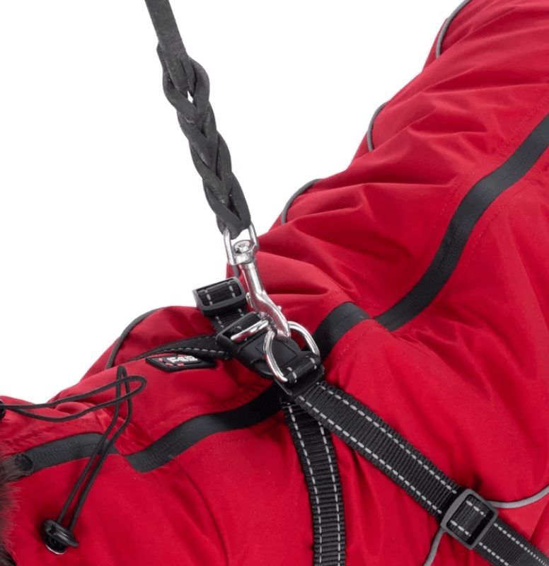 O casaco para cães muito é fácil de vestir, uma vez que o seu cão pode simplesmente entrar nas aberturas com as patas dianteiras. Graças ao peitoral infinitamente ajustável e aos cordões no pescoço e nas costas, o casaco de cão TIAKI com peitoral Arkon pode ser perfeitamente ajustado ao tamanho do seu patudo. As duas argolas em D por cima do fecho de clique do peitoral permitem fixar diretamente a trela e protegem o tecido do desgaste.