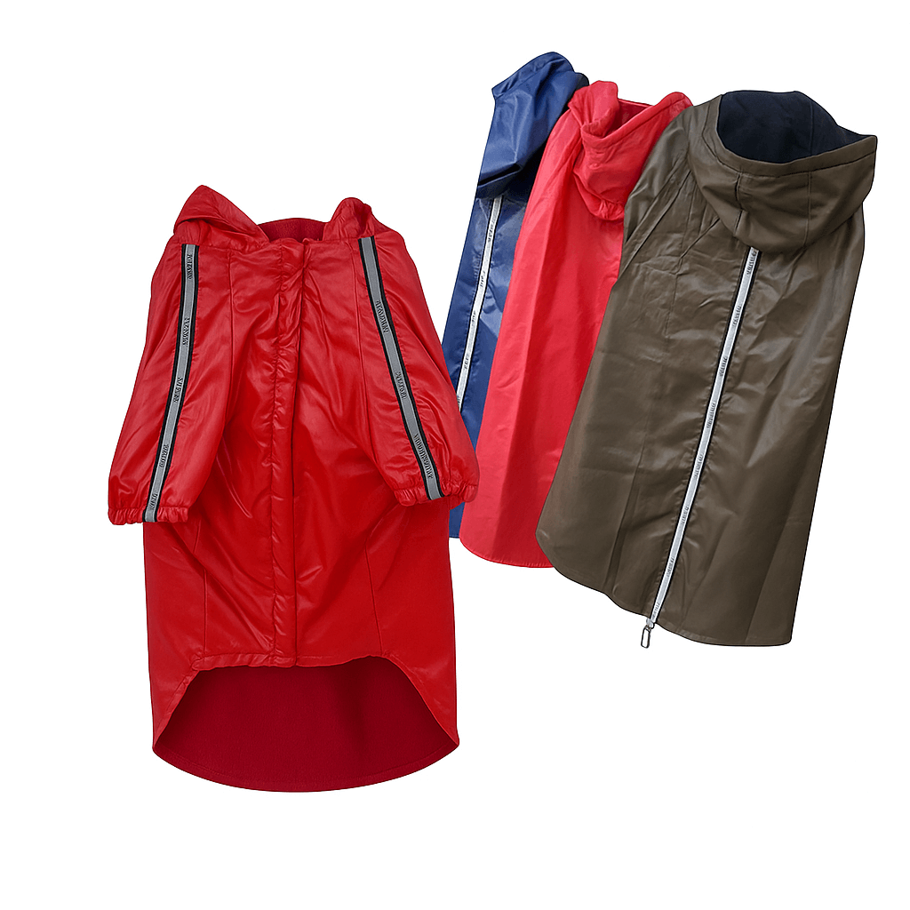 Disponivel em azul, castanho e vermelho. Para cães grandes. Com capuz.