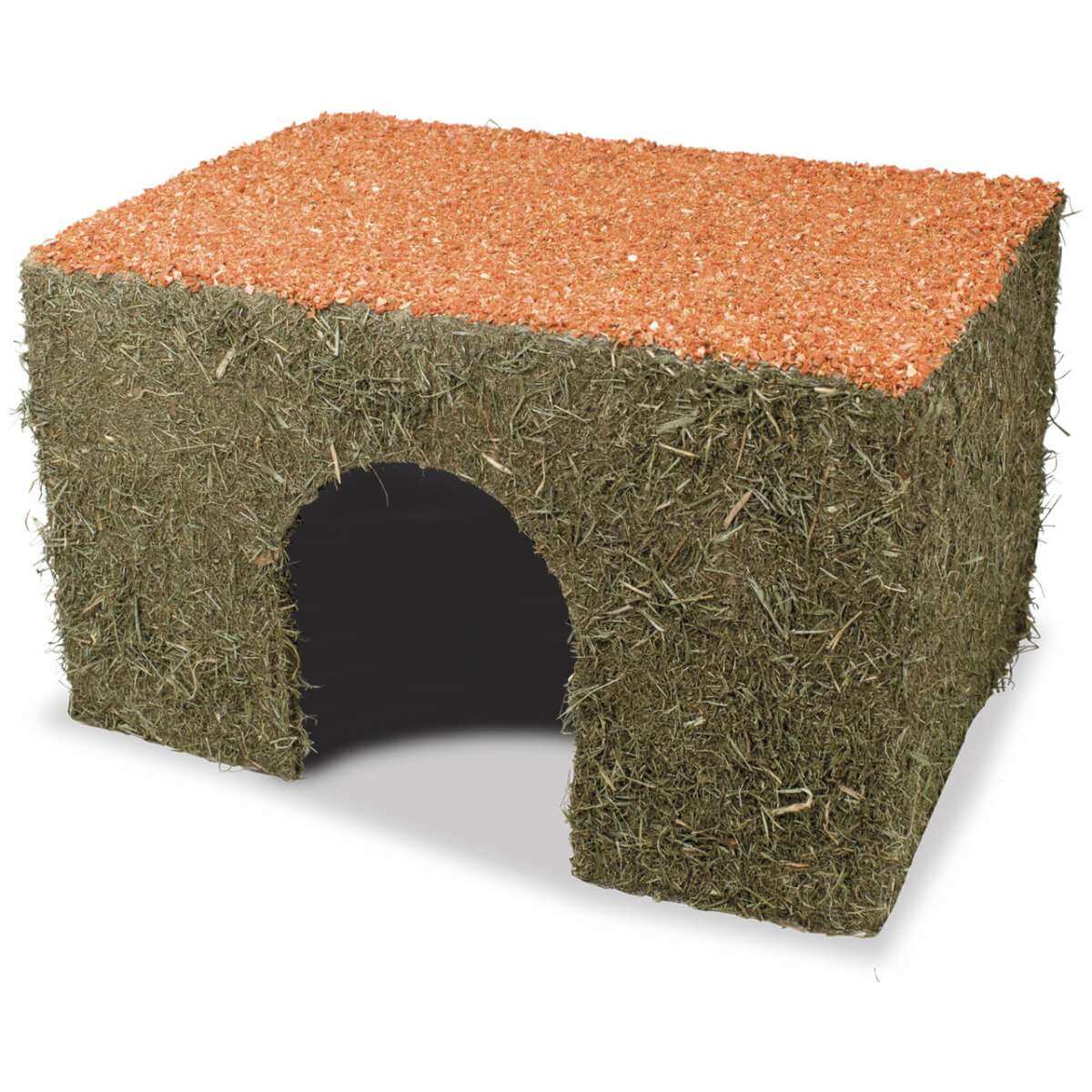 O esconderijo é envolto em feno aromático de prado de montanha de prados naturais locais no coração da Baviera e carrega um telhado deliciosamente abastecido com pedaços crocantes de cenoura. Serve como um retiro para roedores e coelhos anões e é bem-vindo para ser roído.