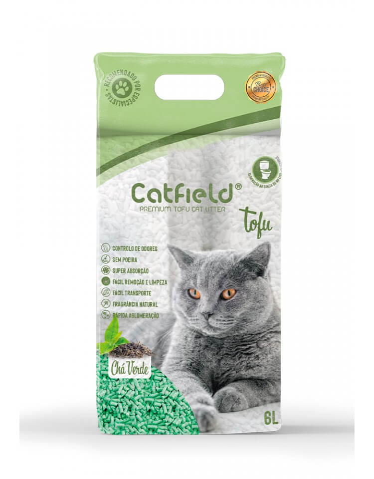 Catfield® Premium Cat Litter Tofu, é um absorvente para higiene de gatos, inteiramente de origem vegetal à base de soja, 100% natural, biodegradável e isento de componentes químicos e seguro mesmo se acidentalmente ingerido. As fibras vegetais de tofu retêm os líquidos criando uma bola compacta, facilmente removível e eliminável na sanita, no lixo doméstico ou utilizada como fertilizante no jardim. Tem um poder de absorção muito grande e retém os maus odores. O tofu é leve e suave nas patas, 100% seguro e não tóxico para humanos ou animais, não risca o chão nem solta poeiras.
