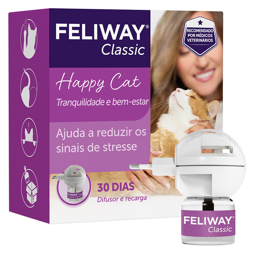 O difusor Classic da Feliway cria um ambiente tranquilo em casa para o gato. Evita marcações com urina, arranhões nos móveis, ou mesmo que o gato se esconda. Este difusor proporciona maior conforto ao seu gato, que passa muito tempo dentro de casa sozinho.