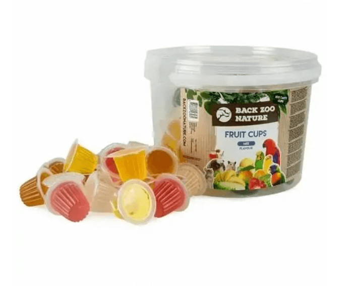 Balde grande com mistura de frutas em copos, 100 unidades, para pássaros / papagaios / roedores / répteis. Este balde contém 6 sabores diferentes de copos, num total de 100 copos. Contém os sabores: Morango, Banana, Mel, Melão, Iogurte e Laranja.