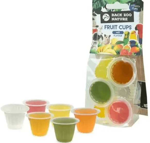 Mistura de frutas em copos, 6 unidades, para pássaros / papagaios / roedores . Contém os sabores: Morango, Banana, Mel, Melão, Iogurte e Laranja.