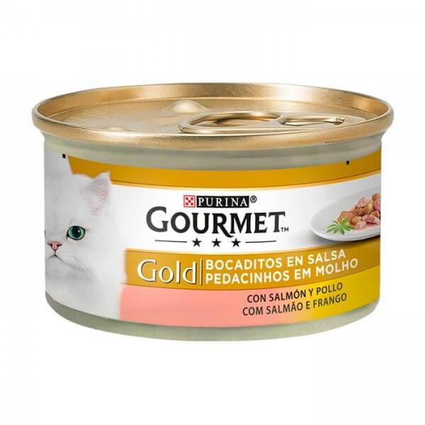 PURINA® GOURMET® Gold Pedacinhos em Molho com Salmão e Frango 85gSauves pedaços com ingredientes selecionados e cozinhados num perfeito e delicioso molho, para um rico e extraordinário sabor