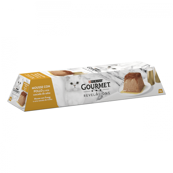 Gourmet Revelations é uma mousse delicada com um delicioso molho de cobertura: um alimento nutritivo e extremamente saboroso, para o seu gato. Com uma forma única de pirâmide, a embalagem, totalmente reciclada, é fácil de abrir e de servir. Um verdadeiro momento de degustação para os felinos!