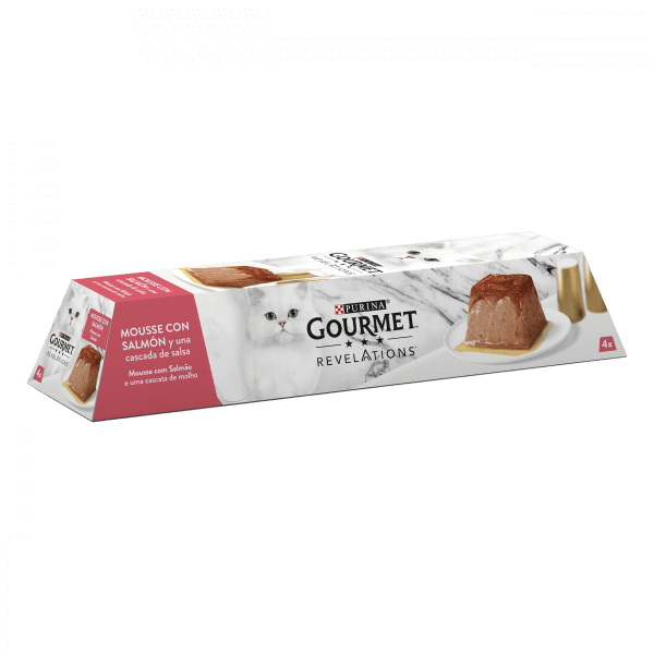 Gourmet Revelations é uma mousse delicada com um delicioso molho de cobertura: um alimento nutritivo e extremamente saboroso, para o seu gato. Com uma forma única de pirâmide, a embalagem, totalmente reciclada, é fácil de abrir e de servir. Um verdadeiro momento de degustação para os felinos!