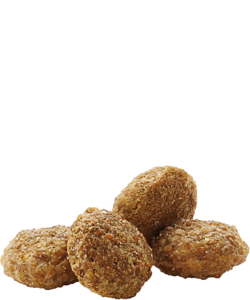 cereais (40%), subprodutos de origem vegetal (polpa de beterraba 1%), legumes (ervilhas 15%), carnes e subprodutos animais (frango 4%), óleos e gorduras (óleo de salmão 1%), sementes (linhaça 2%), substâncias minerais, frutas (maçã 4%*), leveduras, ovos e produtos de ovos, fruto-oligossacáridos (0,3%), iúca (125 mg/kg)