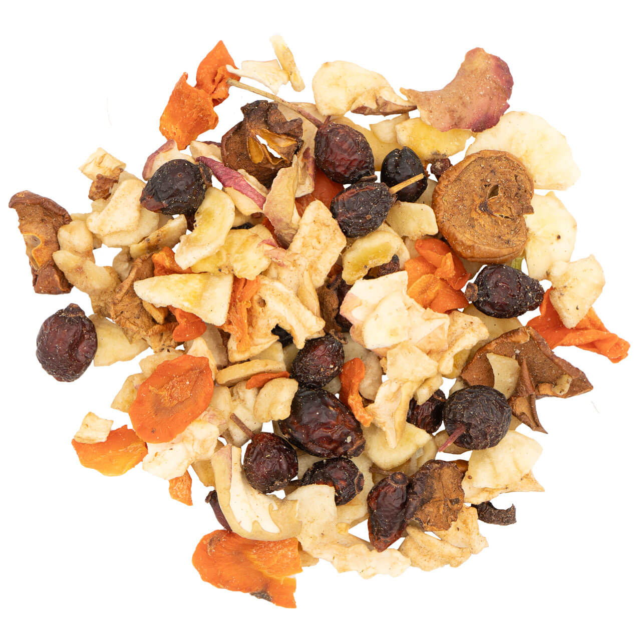 Rosa mosqueta, bananas 22,3%, cenouras, maçãs 14%, óleo de coco, batata, pastinaga, sorveiras, alho-poró, óleo de colza