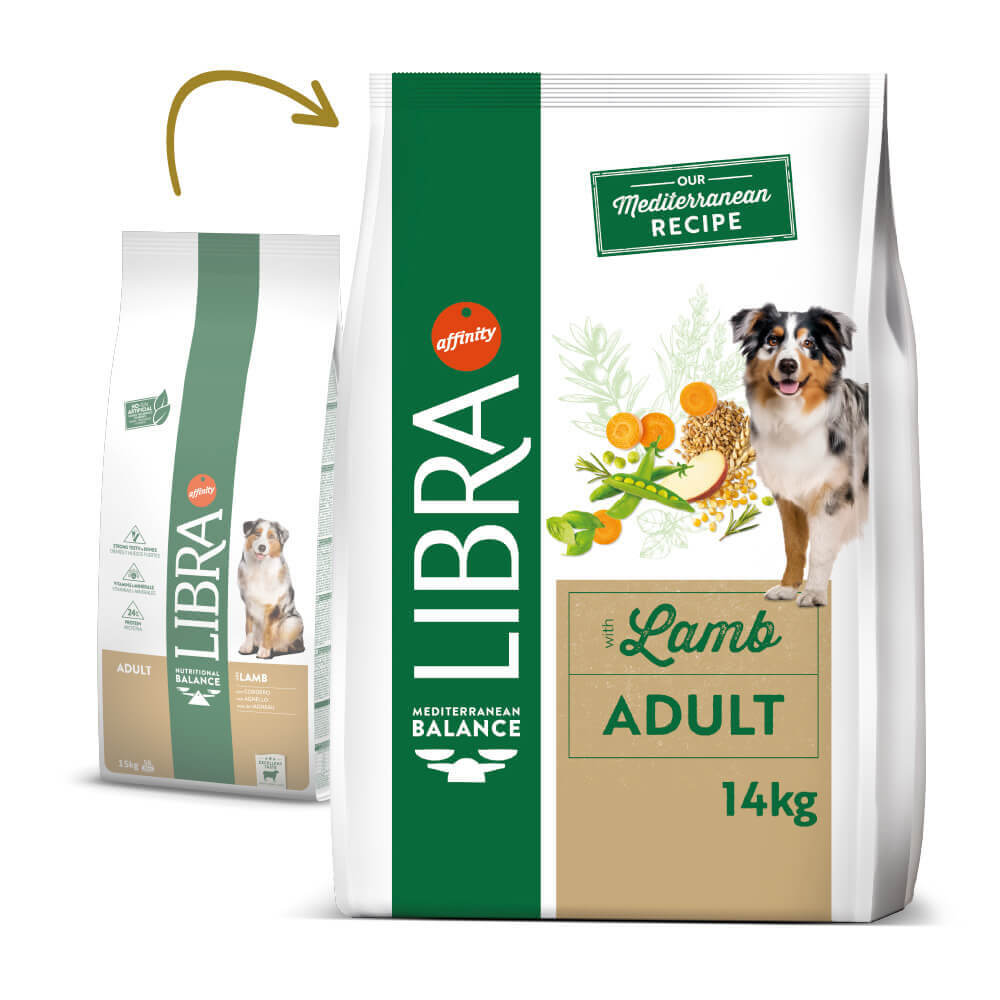 Libra Adult Lamb é um alimento seco completo para cães adultos, de cordeiro. Uma ração ideal para cães com sensibilidade alimentar à proteína do frango. Este alimento contribui para dentes e ossos fortes e tem vitaminas e minerais, para que o seu melhor amigo tenha uma vida feliz e saudável.