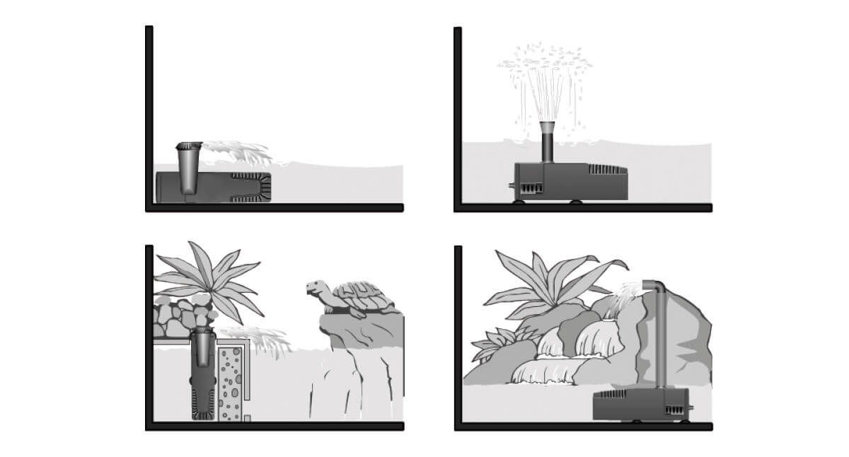 Filtro interno multifuncional. Ação de filtragem dupla. Cartuchos de filtragem substituíveis. A saída de água pode ser girada em 360°. Pode ser conectado a qualquer mangueira rígida ou flexível. Funciona bem em qualquer posição. Fluxo ajustável. Recurso de aeração. O motor protegido não superaquece. Miniaturizado, silencioso, fácil de usar e completo com acessórios.