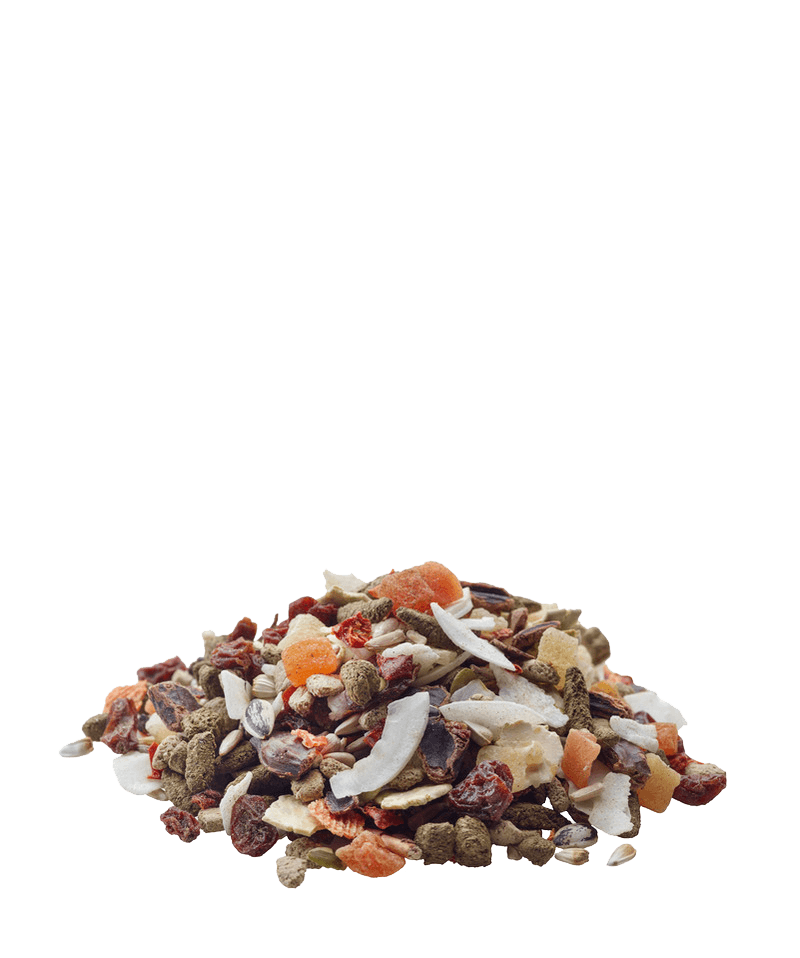 frutas (damasqueiro 7%, ananás 7%, papaia 7%), subprodutos de origem vegetal, hortaliças, grãos, extratos de proteínas vegetais, substâncias minerais, óleos e gorduras, FOS, calêndula, MOS, algas, iúca