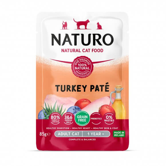 Ração húmida para gatos adultos totalmente natural com 80% de Peru & Frango. Os alimentos húmidos para gatos adultos Naturo não contêm corantes, sabores ou conservantes artificiais e não contêm cereais que muitas vezes podem causar alergias. Nossa ração natural para gatos adicionou taurina para apoiar a visão saudável, função cardíaca, formação de bile e reprodução, bem como vitaminas, minerais e óleos essenciais para uma pele saudável e uma pelagem brilhante.