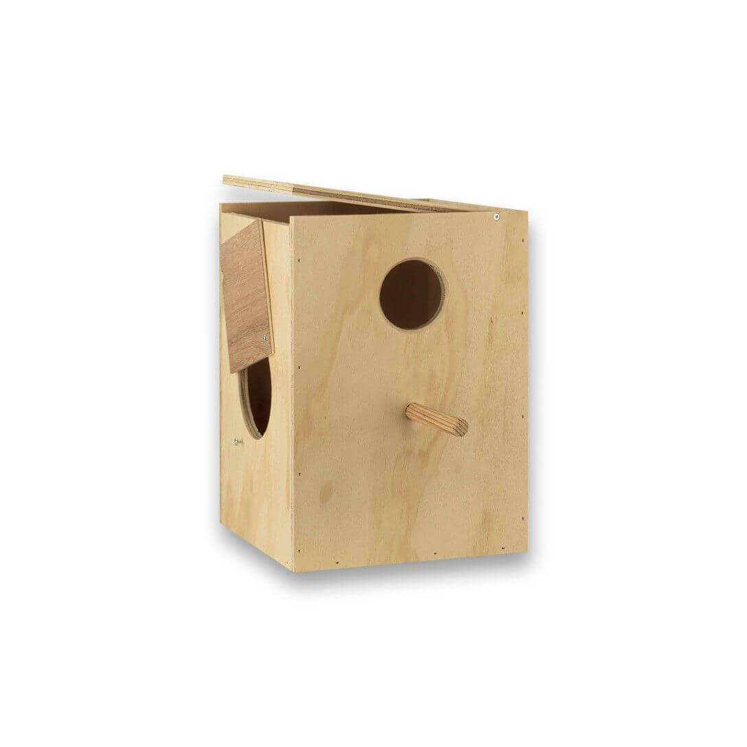 Ninho caturra vertical com porta para espreitar do lado esquerdo e também com tampa por cima com abertura igualmente para o lado esquerdo. (estando de frente para o ninho).
