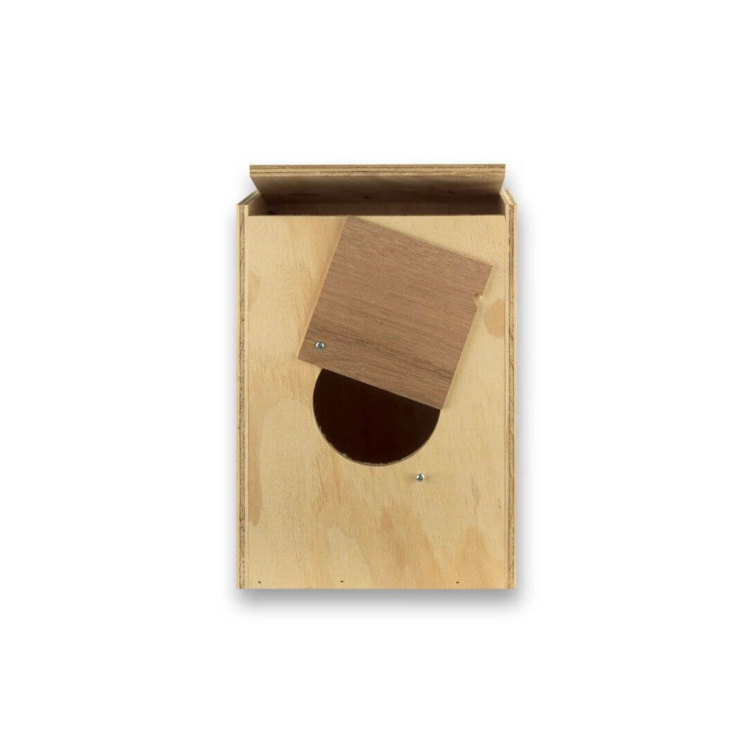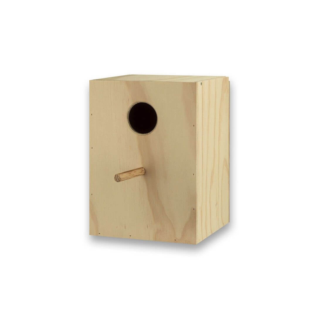 Ninho caturra vertical com porta para espreitar traseira e também com tampa por cima com abertura igualmente para trás. (estando de frente para o ninho).