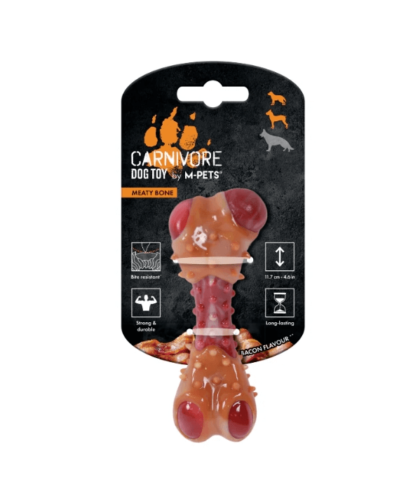 Ossos saborosos, a linha CARNIVORE by M-PETS® traz um toque saboroso para as sessões de brincadeira, oferecendo uma experiência deliciosa que seu cão vai adorar. Perfeitos para brincadeiras interativas, tempo de união ou simplesmente mantê-los alegremente entretidos, esses brinquedos tornam cada momento mais agradável para você e seu animal de estimação, à medida que po seu cão vai roendo, o osso vai deixando um aroma a bacon.