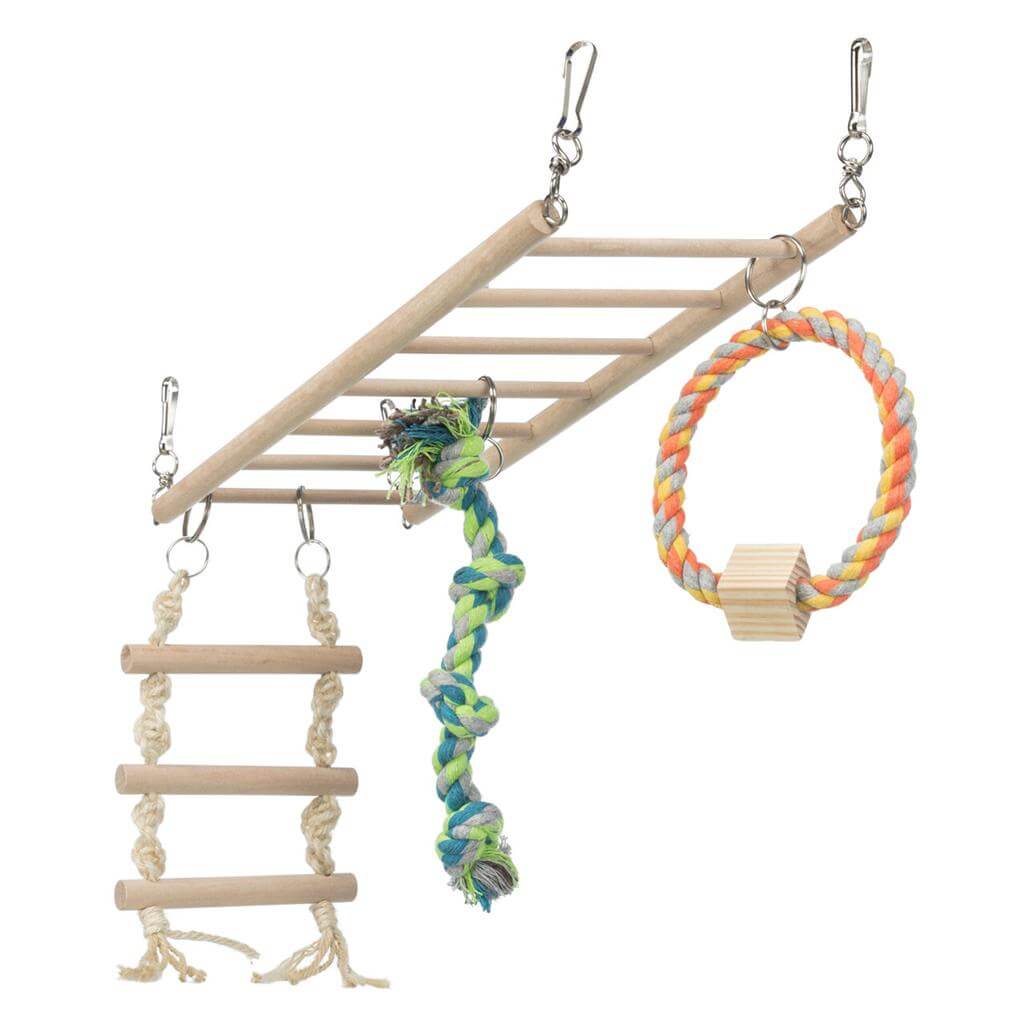 Escada de madeira com escada em corda, corda de brincar e anel de corda com bloco de madeira