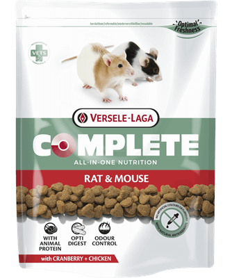 Versele-Laga Complete Rat & Mouse é uma nutrição sem preocupações. Os pellets "tudo em um", excepcionalmente saborosos, evitam comportamentos alimentares selectivos. Assim, a sua ratazana ou rato obtém todos os nutrientes essenciais e mantém-se perfeitamente saudável. A alimentação com frango como fonte natural de proteína animal e cereais para energia e vitalidade é especialmente adaptada às necessidades nutricionais de ratos e ratazanas. A textura ótima dos pellets proporciona uma limpeza extra dos dentes e reduz a placa dentária. A Versele-Laga Complete Rat & Mouse é desenvolvida por veterinários, com base em conhecimentos científicos avançados.