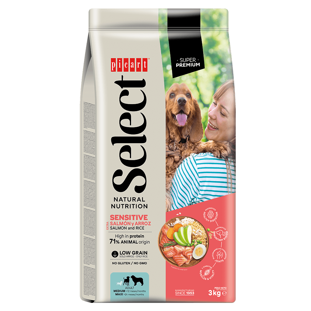 Select Sensitive de salmão é um alimento seco completo, adequado a cães com intolerâncias alimentares. Uma ração de ótimo sabor, sem glúten de trigo e com um complexo antioxidante fisiológico natural. Este alimento favorece uma boa saúde geral ao patudo, sendo de ótimo sabor e elevada digestibilidade.