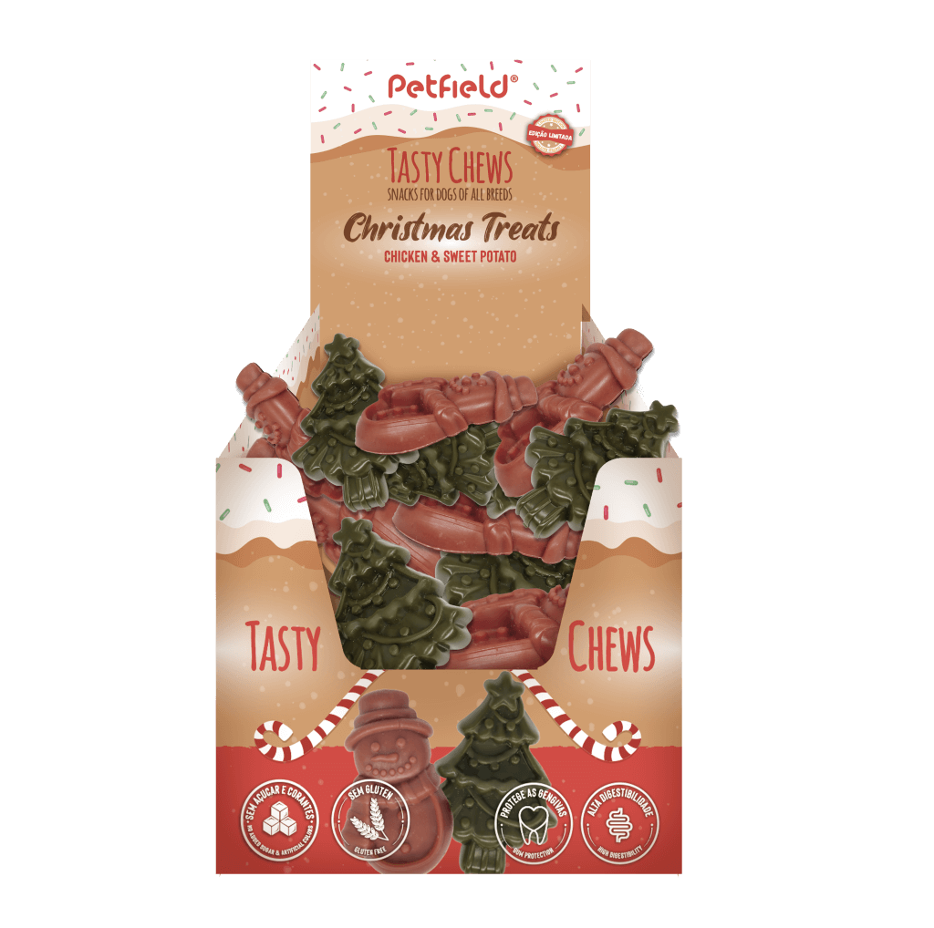 Árvore de Natal/Verde: Farinha de batata-doce, farinha de ervilha, frango, glicerina vegetal, brócolos secos, carbonato de cálcio, levedura seca, óleo de menta, sorbato de potássio. Boneco de Neve/Vermelho: Farinha de batata-doce, farinha de ervilha, frango, glicerina vegetal, tomate seco, beterraba seca, carbonato de cálcio, levedura seca, sorbato de potássio.