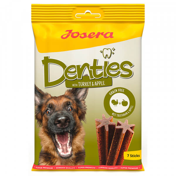 Josera Denties são snacks deliciosos que ajudam de forma divertida a limpar os dentes do cão. Ideais para recompensar o animal ou para lhe oferecer como lanche, entre refeições, mantendo uma alimentação saudável. Graças à celulose, Denties Turkey & Apple garantem cuidados dentários diários.