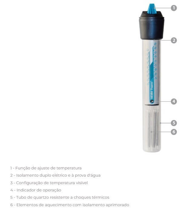 Aquecedor de aquário automático totalmente submersível. Ajuste fácil e preciso da temperatura desejada. Indicador de temperatura em forma de termômetro. Termostato sensível e confiável que mantém a temperatura constante. Elemento de aquecimento altamente eficiente e com economia de espaço. Projetado e construído para operar por muito tempo com total segurança. Completo com gancho de suporte e ventosas de ancoragem. Tubo de quartzo resistente a choques térmicos e proteção contra impactos NEWA Protection.