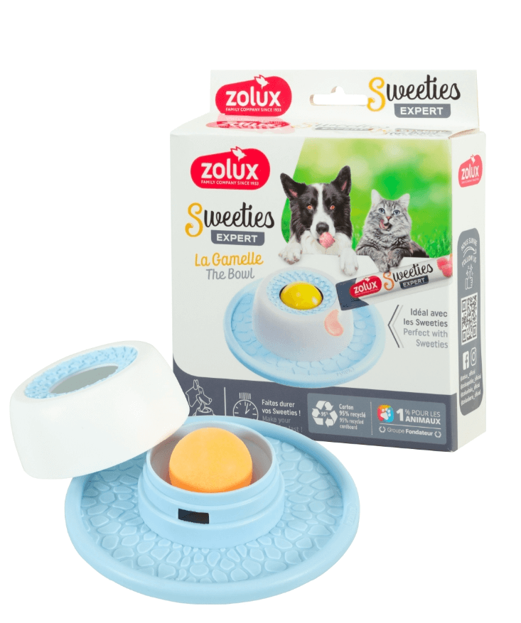 Esta tigela foi especialmente projetada para transformar um simples deleite em uma atividade profissional. Seu engenhoso sistema de bolas giratórias, combinado com a textura dos Sweeties, obriga o animal a lamber suavemente para apreciá-lo, prolongando assim a experiência: