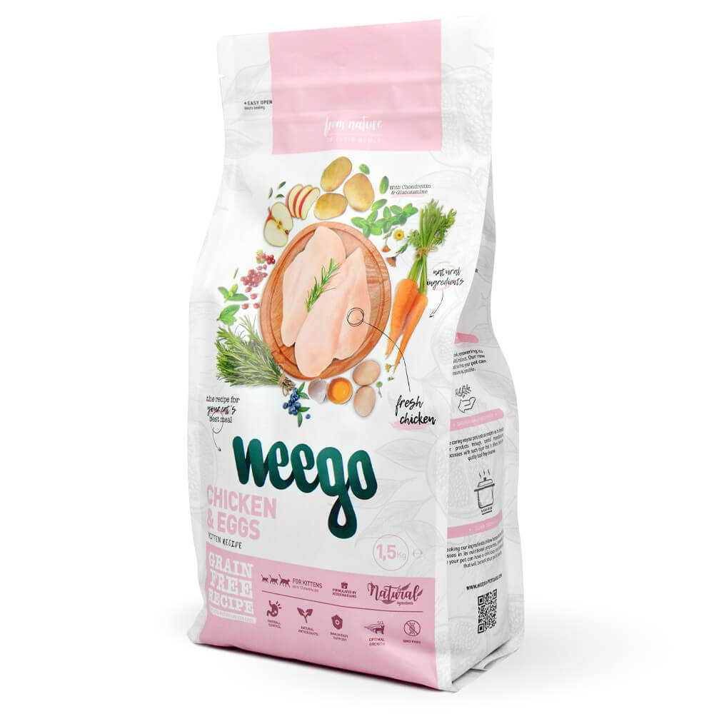 Alimento seco para gatinhos. Natural, sem cereais, completo e equilibrado à base de frango e adequado para gatinhos, de qualquer raça ou tamanho.